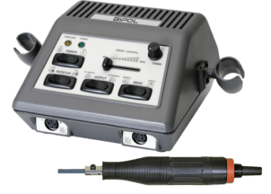 Ensemble hybride d’ébavurage et de polissage alliant la technologie asynchrone (moteurs sans charbons) à la technologie traditionnelle (moteurs avec charbons). La technologie permet d’utiliser des pièces à main avec un minimum d’entretien avec une plus grande durée de vie moteur, et, pour pratiquement le même encombrement, mais un poids un peu plus élevé, un couple et une vitesse très supérieurs, ainsi qu’un frein électronique de vitesse.